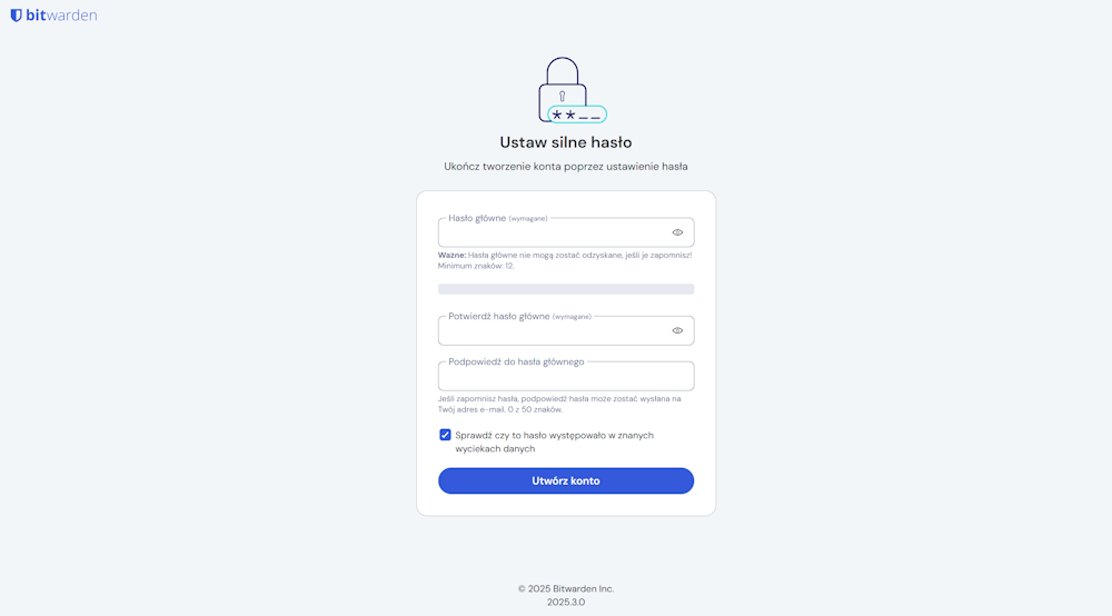 3. Ustaw silne hasło główne – to najważniejsze hasło w całym systemie. Minimum 20 znaków, użyj wielkich i małych liter, cyfr oraz znaków specjalnych (np. @!#$%).