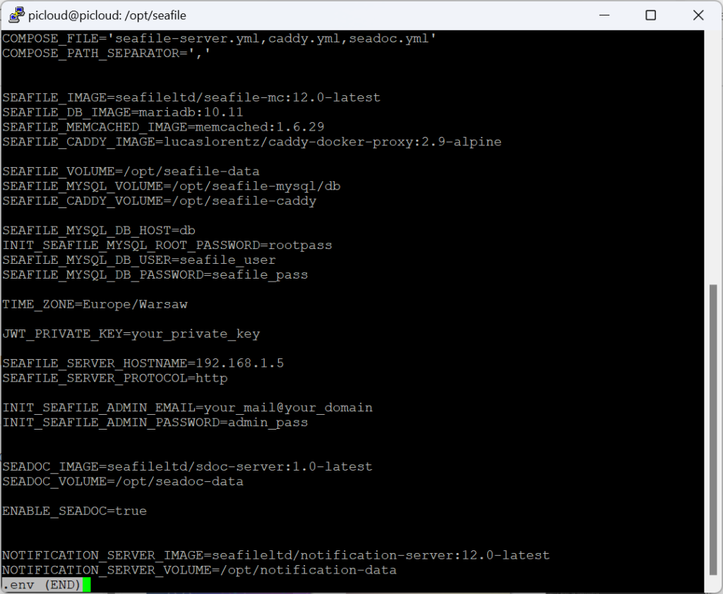 Istnieje kilka sposobów instalacji, ja skorzystałem z wariantu instalacji za pomocą kontenerów Docker, który jest opisany na stronie SeaFile (tutaj).